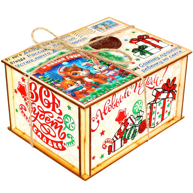 Сладкий подарок на Новый Год в упаковке из фанеры весом 300 грамм